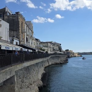 Ce matin départ de Taormine dans notre Kia Picanto pour rejoindre Syracuse, déjà rejoindre les bords de mer relève du challenge et dans les petites ruelles, on est bien contents d’avoir notre micro…